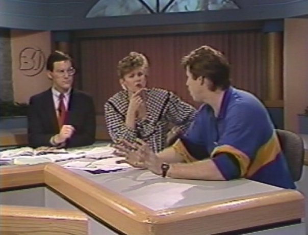 Dave Hargrove/Liz Hurley listen to story from cameraman Scott Bemish talking